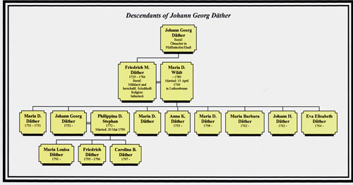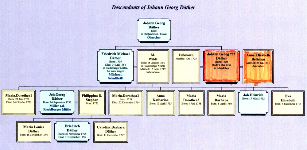 Der Name „Däther“ gehört im Grunde nach zu den seltenen Namen in Deutschland. Nach einer neuen Statistik steht er an der 20.000. Stelle aller Namen in Deutschland. Berücksichtigt man noch, dass die Bevölkerung im 18. Jahrhundert wesentlich kleiner war als heute, kann man davon ausgehen, dass alle Familien mit dem Namen „Däther“ im Jahre 1700 gemeinsame Wurzeln hatten.